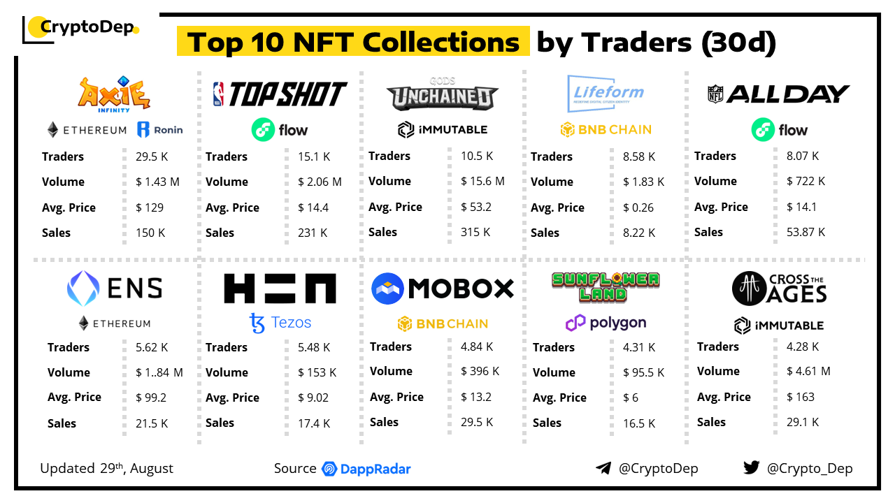 In this post, we analyze top NFT collections by the number of traders in the last 30 days, according to the data from DappRadar. Let's take a look!