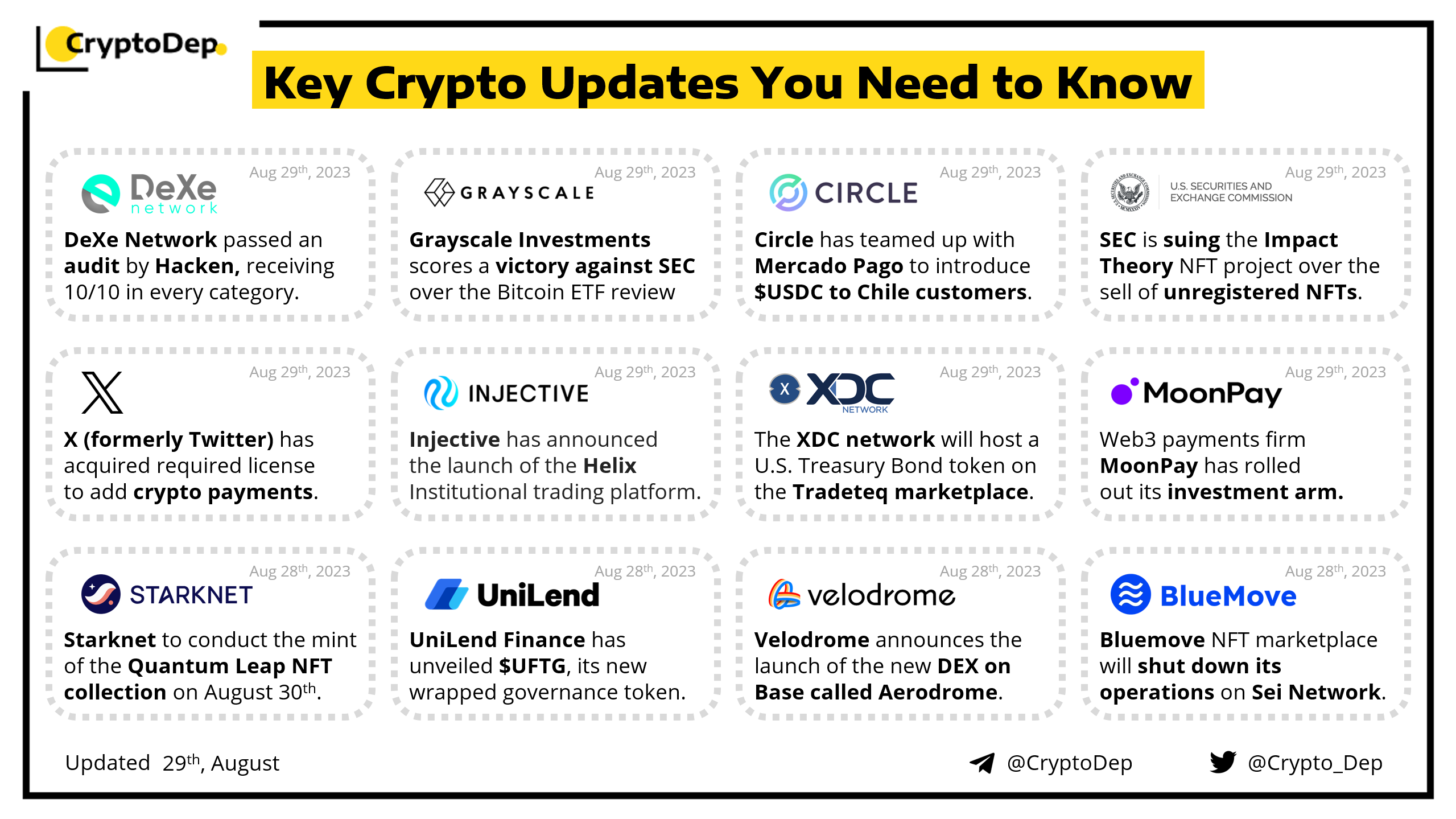 Grayscale, a crypto asset manager, has scored a major victory against the SEC in its efforts to convert its over-the-counter GBTC into a listed Bitcoin $BTC ETF. Previously, the SEC rejected its GBTC application on grounds that the products were not βdesigned to prevent fraudulent and manipulative acts and practices.β Grayscale subsequently sued, and the decision has been overturned. Amid this news, the first cryptocurrency Bitcoin $BTC jumped 7% to $28,000.