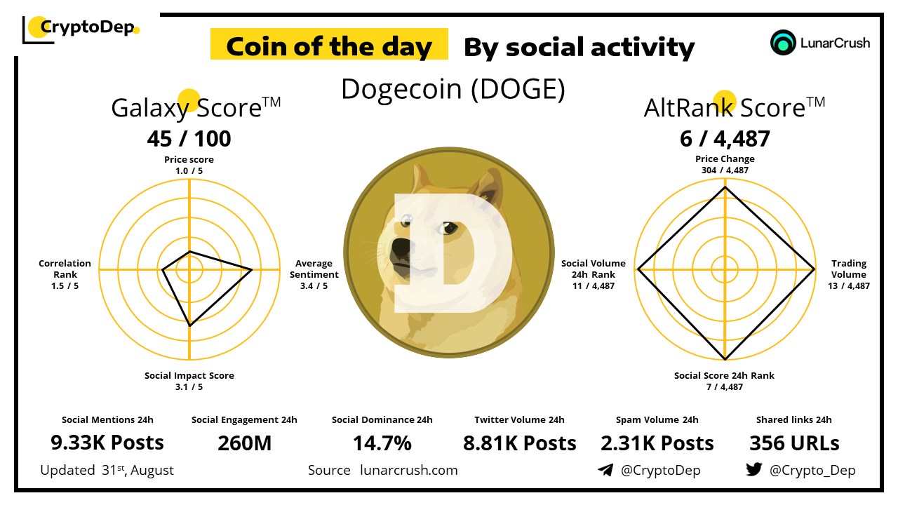 Coin of the day by social activity - Dogecoin (DOGE).