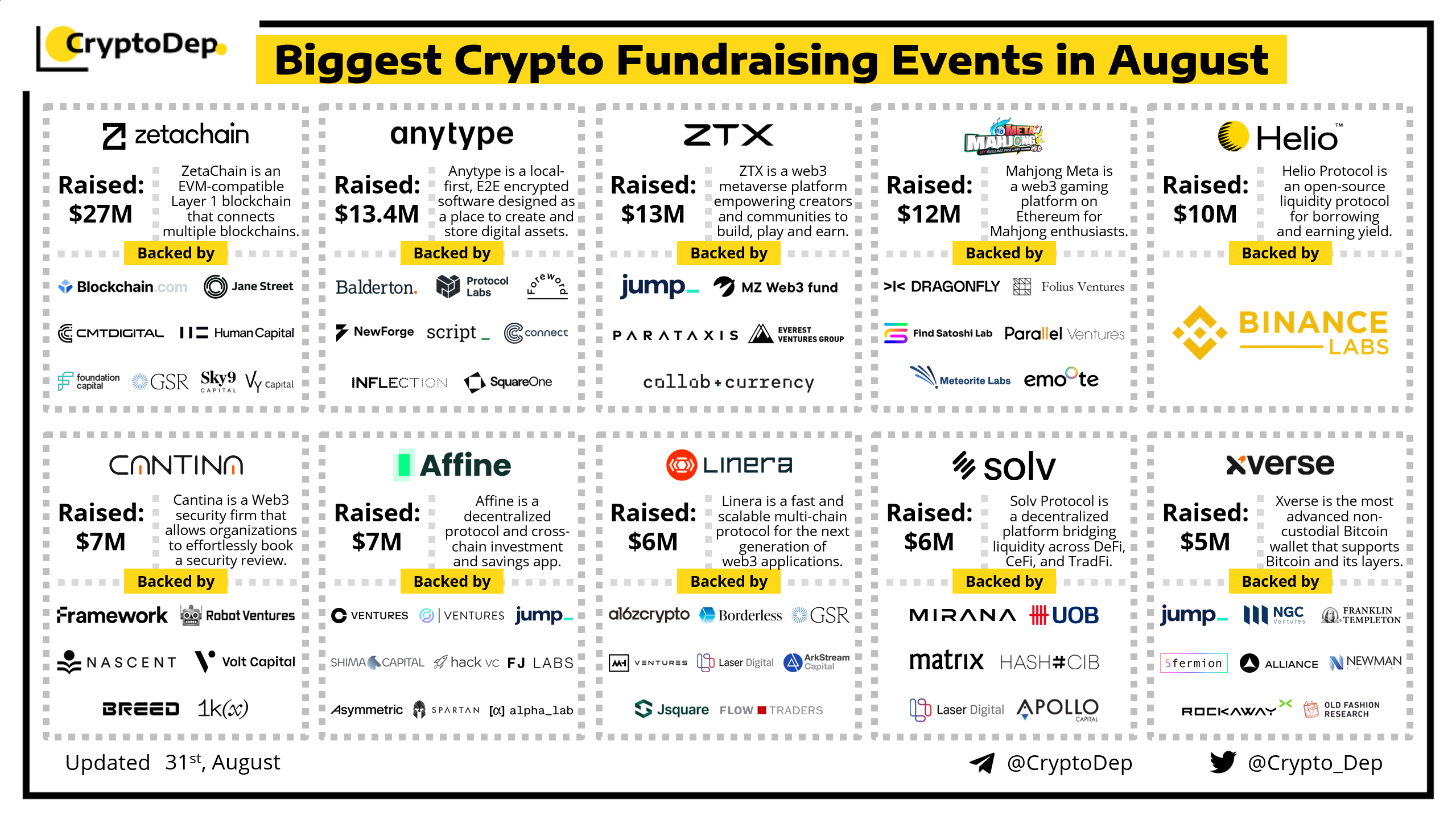 We are excited to present a list of the biggest August crypto fundraising events, backed by well-known investors such as a16z, Binance Labs, Dragonfly, Coinbase Ventures, Circle Ventures, Framework Ventures, NGC Ventures, Shima Capital, Robot Ventures, and others. Let's take a look!