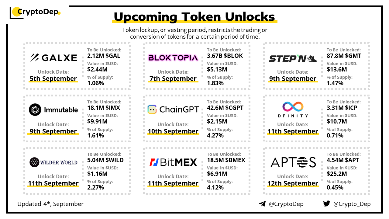 Let's take a look at the compilation of major upcoming token unlocks, diving into details such as dates, amounts, and projects related to tokens that are currently locked up, but will soon be released to the market. During this week, $APT, $GMT, $ICP, $IMX, and $BMEX will have the biggest unlocks.