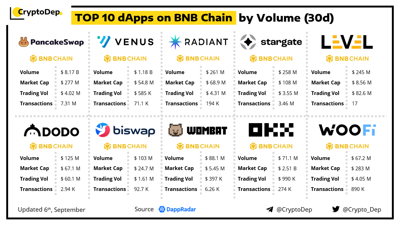 A decentralized application (dApp) is a program built on blockchain that combines a smart contract and a front-end user interface. We present the top dApps on #BNBChain by volume in the last 30 days, according to the data from DappRadar.