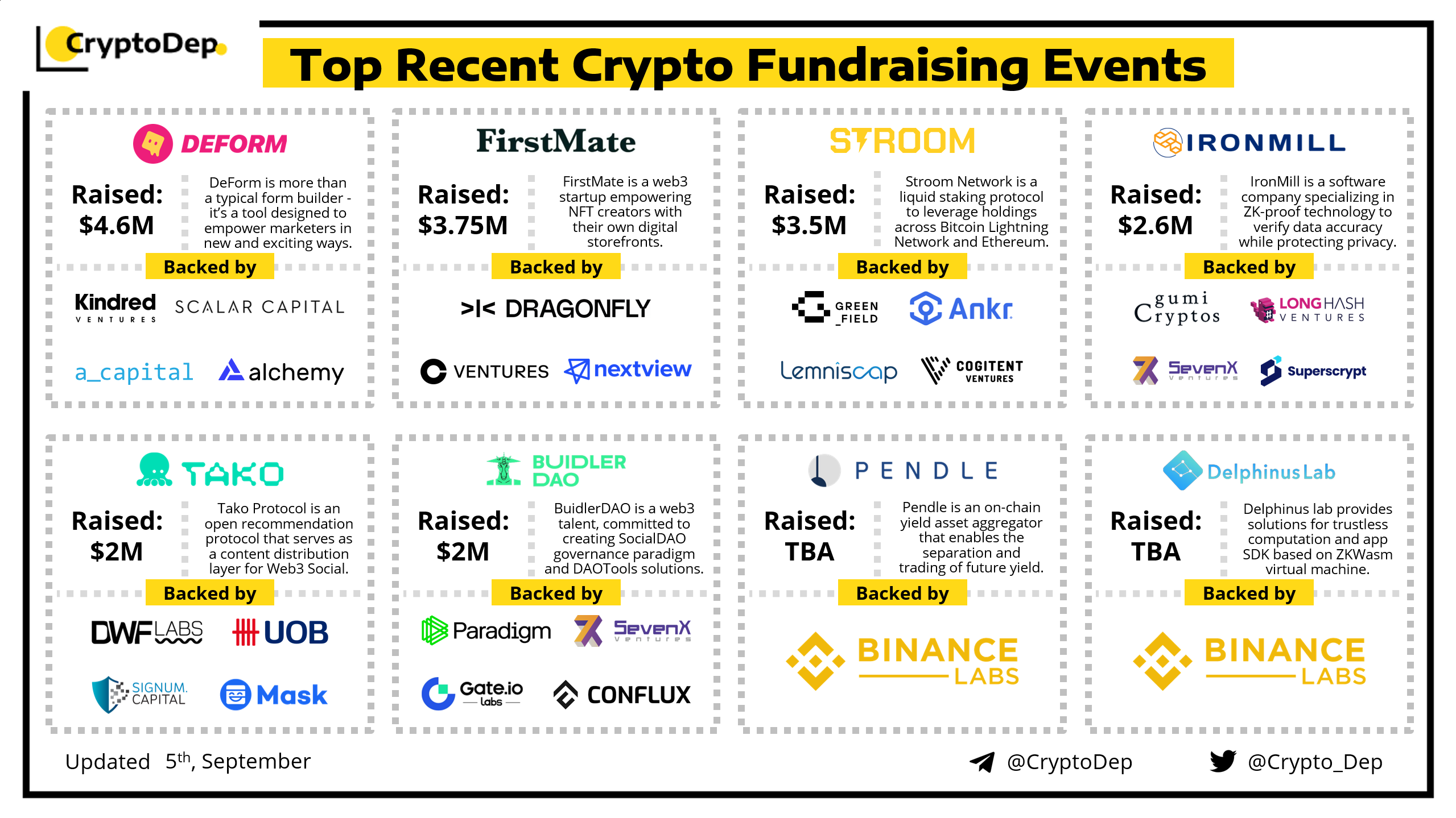 We are excited to present a list of some recent crypto fundraising events, backed by well-known investors such as Paradigm, Binance Labs, Coinbase Ventures, Dragonfly, Signum Capital, Ankr, Conflux, Gate, Mask Network, and others. Let's take a look!