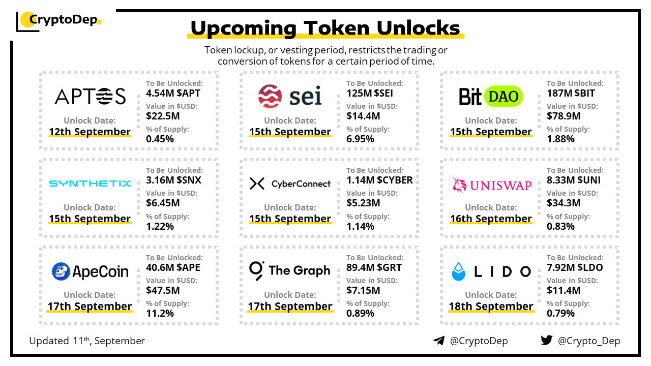 Let's take a look at the compilation of major upcoming token unlocks, diving into details such as dates, amounts, and projects related to tokens that are currently locked up, but will soon be released to the market. During this week, $BIT, $APE, $UNI, $APT, and $SEI will have the biggest unlocks.