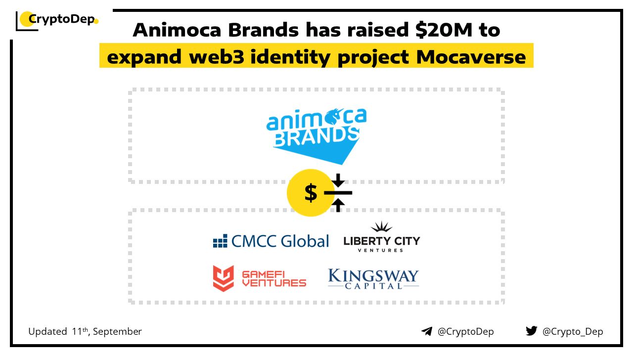 Animoca Brands has conducted a $20M fundraising to expand Mocaverse, a project thatβs building web3-native tools for gaming and entertainment products. The round was led by CMCC Global, with additional participation from Kingsway Capital, Liberty City Ventures and GameFi Ventures. As part of the raise, Animoca has granted to the investors a free-attaching utility token warrant on a 1:1 dollar basis.