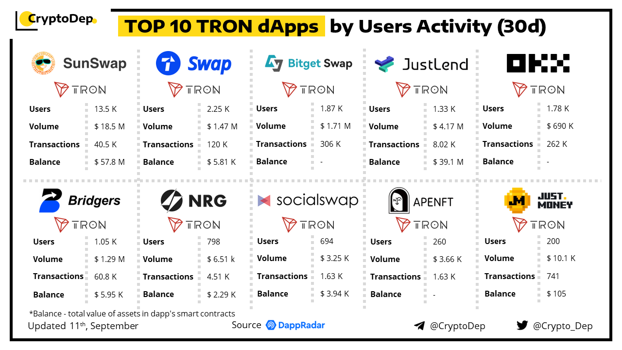 A decentralized application (dApp) is a program built on blockchain that combines a smart contract and a front-end user interface. We present the top dApps on #Tron by users activity in the last 30 days, according to the data from DappRadar.