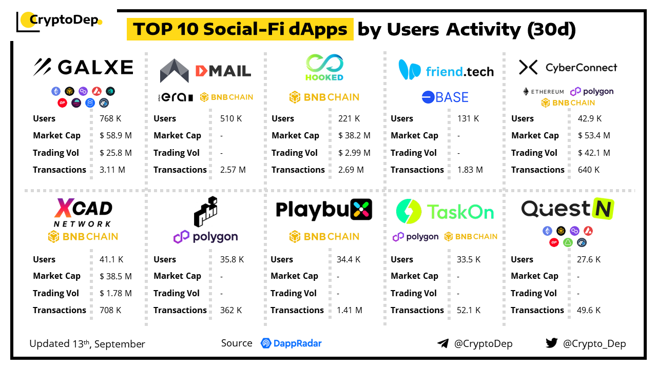 ββTOP 10 Social-Fi dApps by Users Activity (30d)
