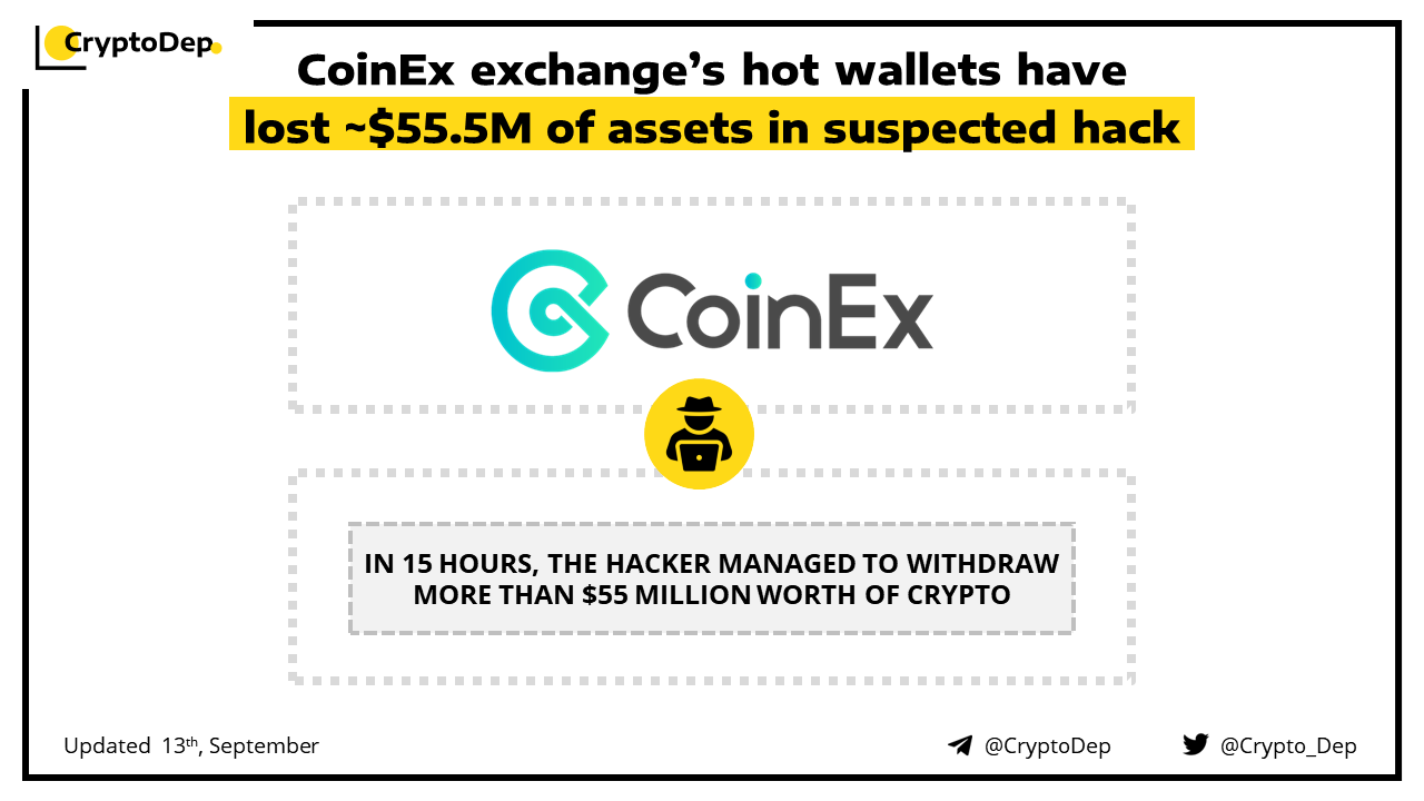 CoinEx exchange has suffered a ~$55M hack, through the exploit of exchange's hot wallets. As a result of the attack, CoinEx hot wallets experienced abnormally large outflows in $ETH, $XRP, $TRX, $BTC and other crypto with the total sum of $55.5M. The team has claimed that the withdrawn crypto is a small part of the exchangeβs total reserves and that users, affected by the hack, will receive 100% compensation for any loss.