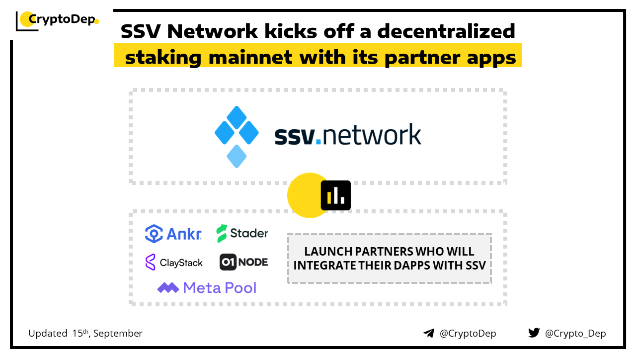 SSV Network has launched its partner mainnet focused on distributed validator technology. The SSV mainnet launch features over ten launch partners who will integrate their staking dApps with SSV β including Stader, Ankr, Stakestar, 01node, Metapool, StakeTogether, XHash, Chainup, Coindelta and Claystack. SSV Network is a fully decentralized, open-source, and trustless DVT Network that provides a reusable infrastructure solution for decentralizing Ethereum validators.