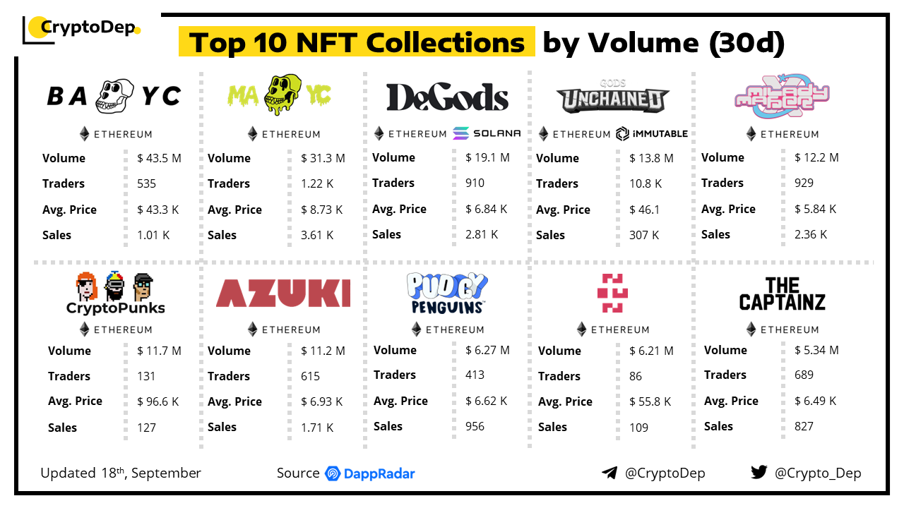 Let's analyze top #NFT collections by volume in the last 30 days, according to the data from DappRadar. Bored Ape Yacht Club, Mutant Ape Yacht Club, DeGods, Gods Unchained, and Milady Maker are among the leaders.