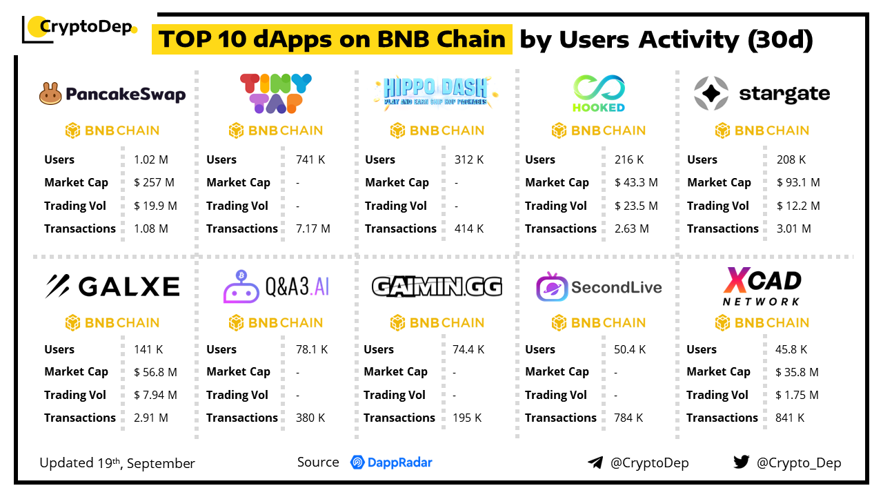 ββTOP 10 dApps on BNB Chain by Users (30d)
