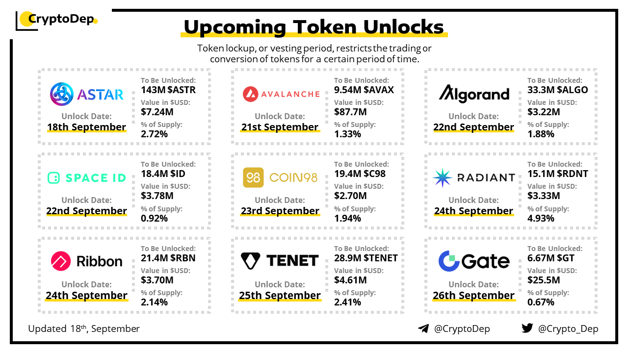 Let's take a look at the compilation of major upcoming token unlocks, diving into details such as dates, amounts, and projects related to tokens that are currently locked up, but will soon be released to the market. During this week, $AVAX, $GT, $ASTR, $TENET, and $ID will have the biggest unlocks.