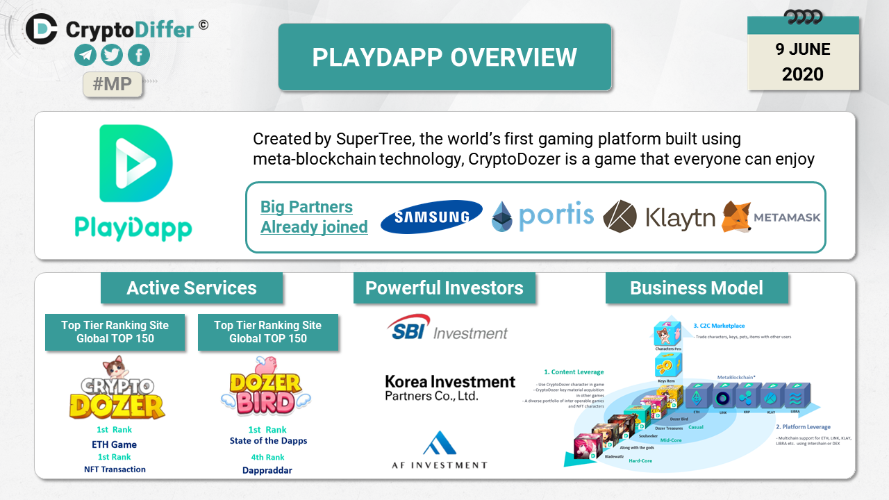 PlayDapp is a dApp game portal that provides C2C Marketplace. All PlayDapp games are interoperable thus providing a portfolio of game content that gamers can enjoy with their non-fungible tokens(NFT). Gamers can also trade their characters and items in the C2C marketplace in addition to increasing the value of the NFT by leveling up, strengthening, and amalgamating them. PlayDapp, created by SuperTree, is the worldβs first gaming platform built using meta-blockchain technology.