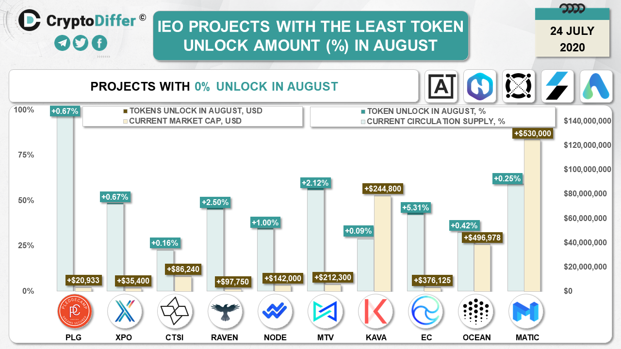 We have chosen ones with the lowest percentage of supply to be unlocked in August 2020. We might miss some projects, so feel free to let us know in our chat or in comments under the twitter post.