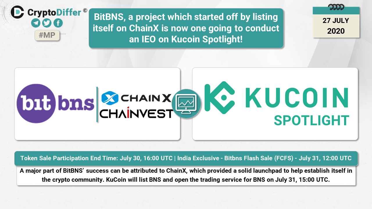A major part of BitBNSβ success can be attributed to ChainX, which provided a solid launchpad to help establish itself in the crypto community. KuCoin will list BNS and open the trading service for BNS on July 31, 15:00 UTC. Token Sale Participation End Time: July 30, 16:00 UTC | India Exclusive - Bitbns Flash Sale (FCFS) - July 31, 12:00 UTC