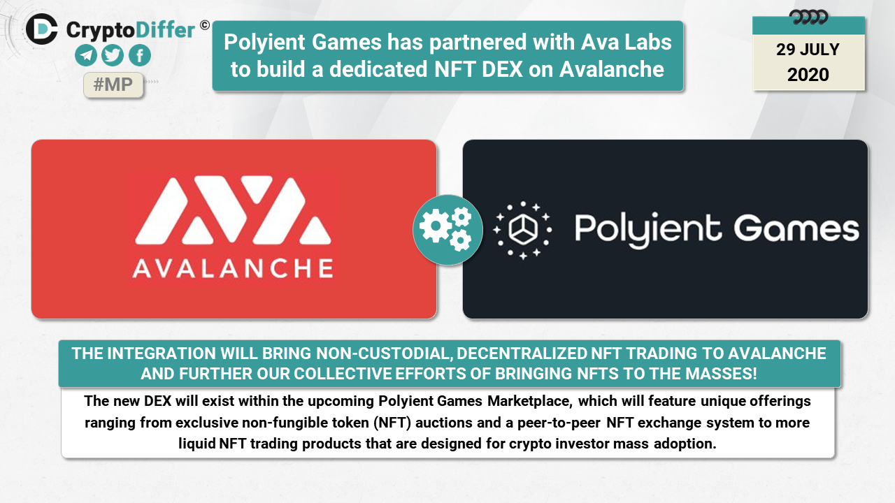 ββPolyient Games, the industryβs first investment firm focused on non-fungible tokens (NFTs) and blockchain gaming, has partnered with Ava Labs to build a dedicated NFT decentralized exchange (DEX) on Avalanche, the highly-scalable, open-source platform for launching decentralized finance (DeFi) applications.