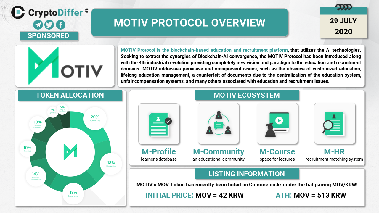 The novel COVID-19 pandemic has brought up the essence of digital education, meanwhile, numerous schools have opened up virtually, and almost 95% of the educational institutions opted for the online education system in order to comply with the social distancing policies to prevent the further outbreak of the pandemic. In the same strain, MOTIV Protocol has been established. MOTIV Protocol is the blockchain-based education and recruitment platform, that utilizes the AI technologies. Seeking to extract the synergies of Blockchain-AI convergence, the MOTIV Protocol has been introduced along with the 4th industrial revolution providing completely new vision and paradigm to the education and recruitment domains. MOTIV addresses pervasive and omnipresent issues, such as the absence of customized education, lifelong education management, a counterfeit of documents due to the centralization of the education system, unfair compensation systems, and many others associated with education and recruitment issues.