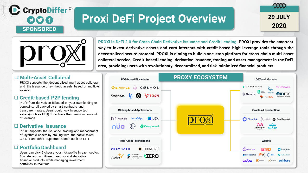 PROXI is aiming to build a one-stop platform for cross-chain multi-asset collateral service, Credit-based lending, derivative issuance, trading and asset management in the DeFi area, providing users with revolutionary, decentralized, and risk-minimized financial products.