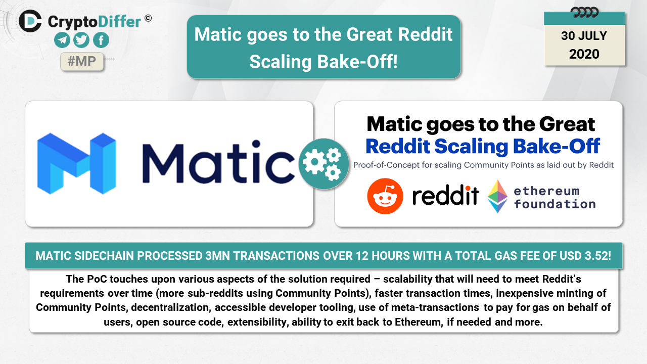 The Matic sidechain processed 3mn transactions over 12 hours with a total gas fees of USD 3.52 as part of the Great Reddit Scaling Bake-Off PoC.