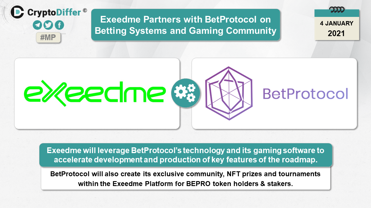 Exeedme will leverage BetProtocolβs technology and its gaming software to accelerate development and production of key features of the roadmap. BetProtocol will also create its exclusive community, NFT prizes and tournaments within the Exeedme Platform for BEPRO token holders & stakers.