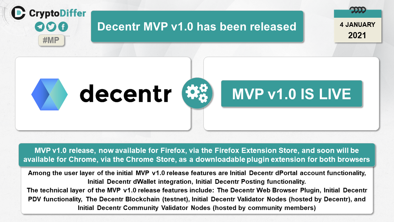 Among the user layer of the initial MVP v1.0 release features are Initial Decentr dPortal account functionality, Initial Decentr dWallet integration, Initial Decentr Posting functionality.