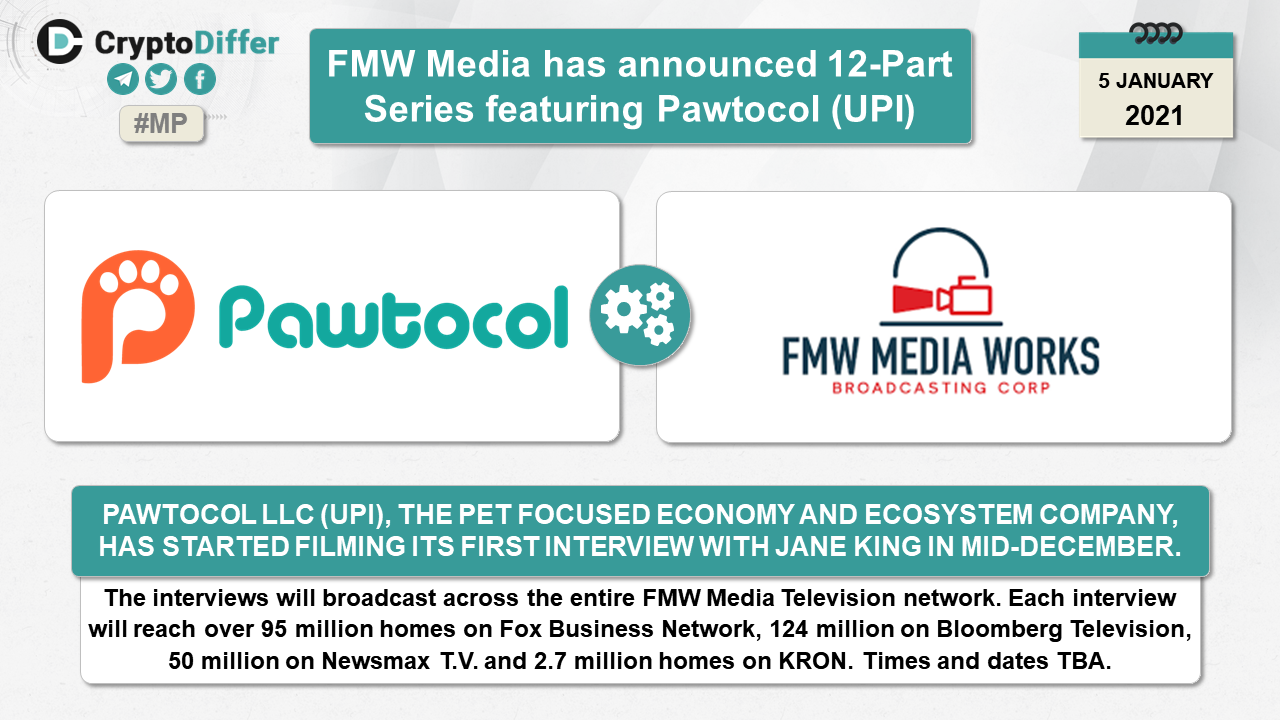 Pawtocol LLC (UPI), the Pet Focused Economy and Ecosystem company, has started filming its first interview with Jane King in mid-December. The interviews will broadcast across the entire FMW Media Television network. Each interview will reach over 95 million homes on Fox Business Network, 124 million on Bloomberg Television, 50 million on Newsmax T.V., and 2.7 million homes on KRON. Times and dates TBA.