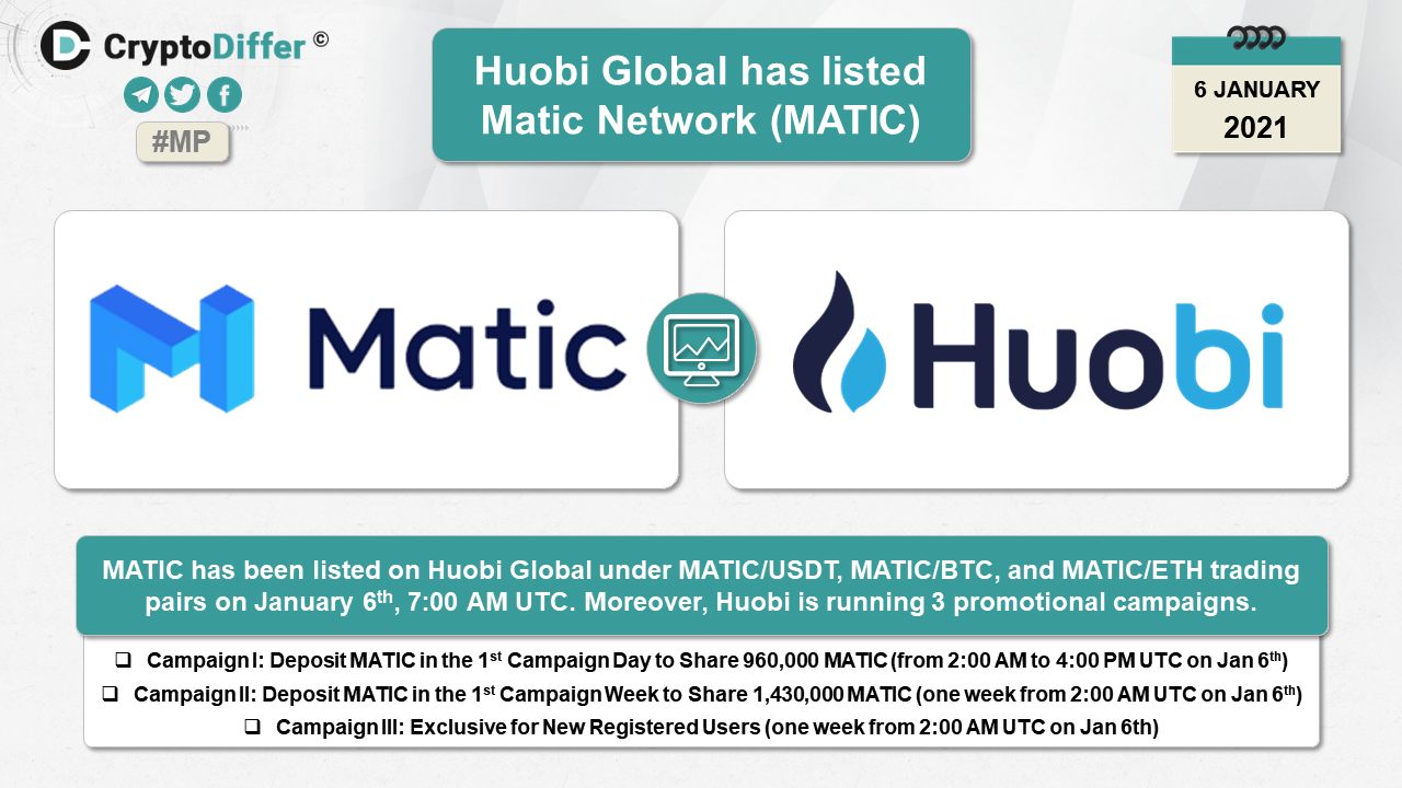 MATIC has been listed on Huobi Global under MATIC/USDT, MATIC/BTC, and MATIC/ETH trading pairs on January 6th, 7:00 AM UTC. Moreover, Huobi will run 3 promotional campaigns.