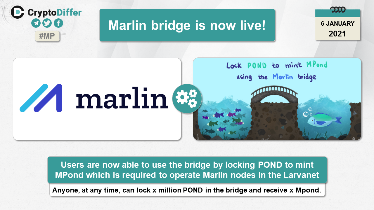 Users are now able to use the bridge by locking POND to mint MPond which is required to operate Marlin nodes in the Larvanet. Anyone, at any time, can lock x million POND in the bridge and receive x MPond.