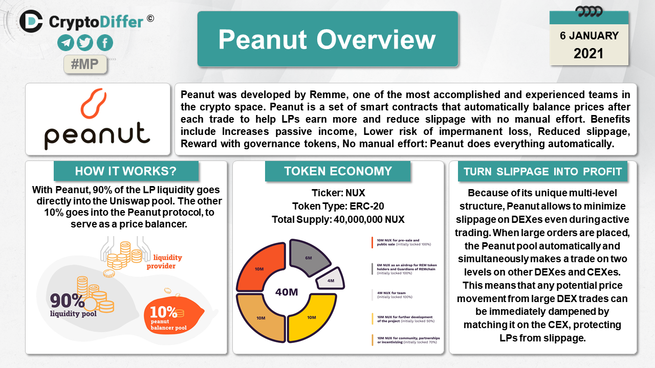 Peanut was developed by Remme, one of the most accomplished and experienced teams in the crypto space. Peanut is a set of smart contracts that automatically balance prices after each trade to help LPs earn more and reduce slippage with no manual effort. Benefits include Increases passive income, Lower risk of impermanent loss, Reduced slippage, Reward with governance tokens, No manual effort: Peanut does everything automatically.