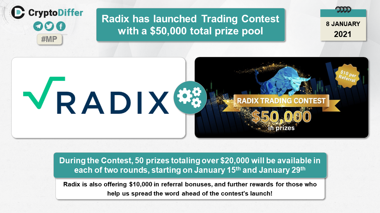 In this Trade Contest the top 50 traders will be rewarded over $20,000 of prizes in each of the two rounds, starting on January 15th and January 29th. Radix is also offering $10,000 in referral bonuses, and further rewards for those who help us spread the word ahead of the contest's launch!