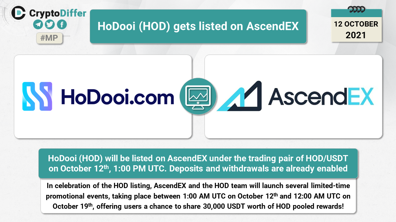 HoDooi (HOD) will be listed on AscendEX under the trading pair of HOD/USDT on October 12th, 1:00 PM UTC. Deposits and withdrawals are already enabled.