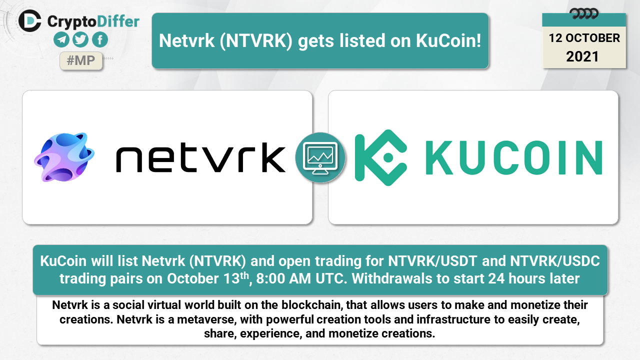 KuCoin will list Netvrk (NTVRK) and open trading for NTVRK/USDT and NTVRK/USDC trading pairs on October 13th, 8:00 AM UTC. Withdrawals to start 24 hours later.
