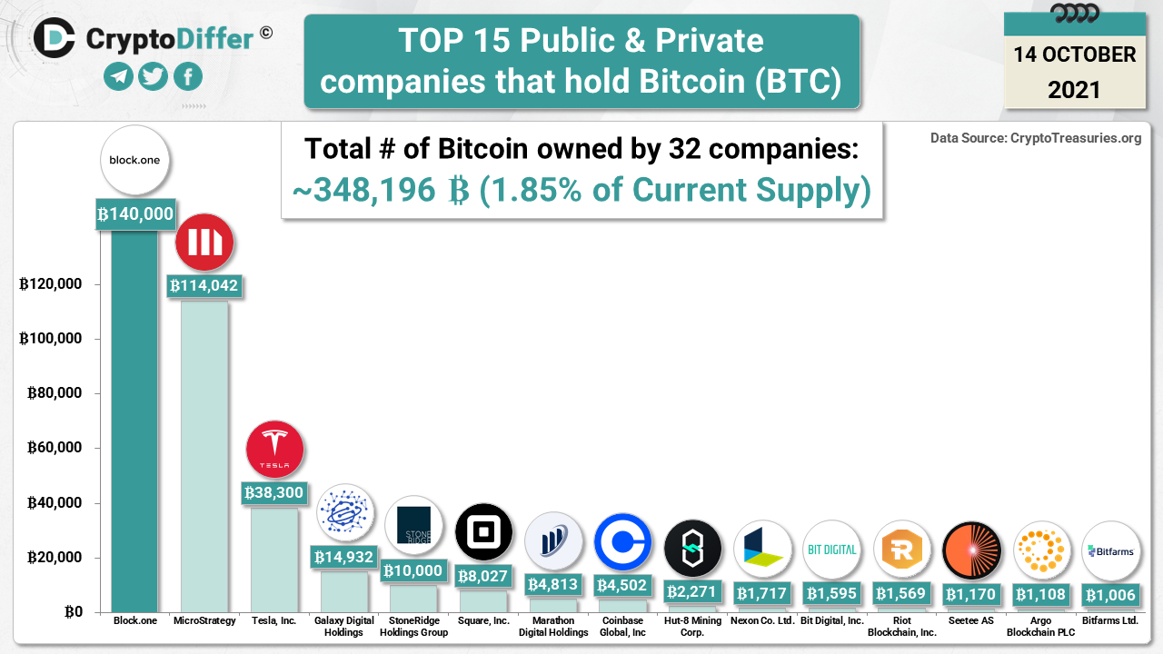 According to Crypto Treasuries, ~348,196 BTC are owned by 32 public and private companies. It's almost ~1.85% of the current circulation supply of Bitcoin & worth $20.1B USD. Top 3 companies that hold BTC are Block.One, MicroStrategy & Tesla Inc.