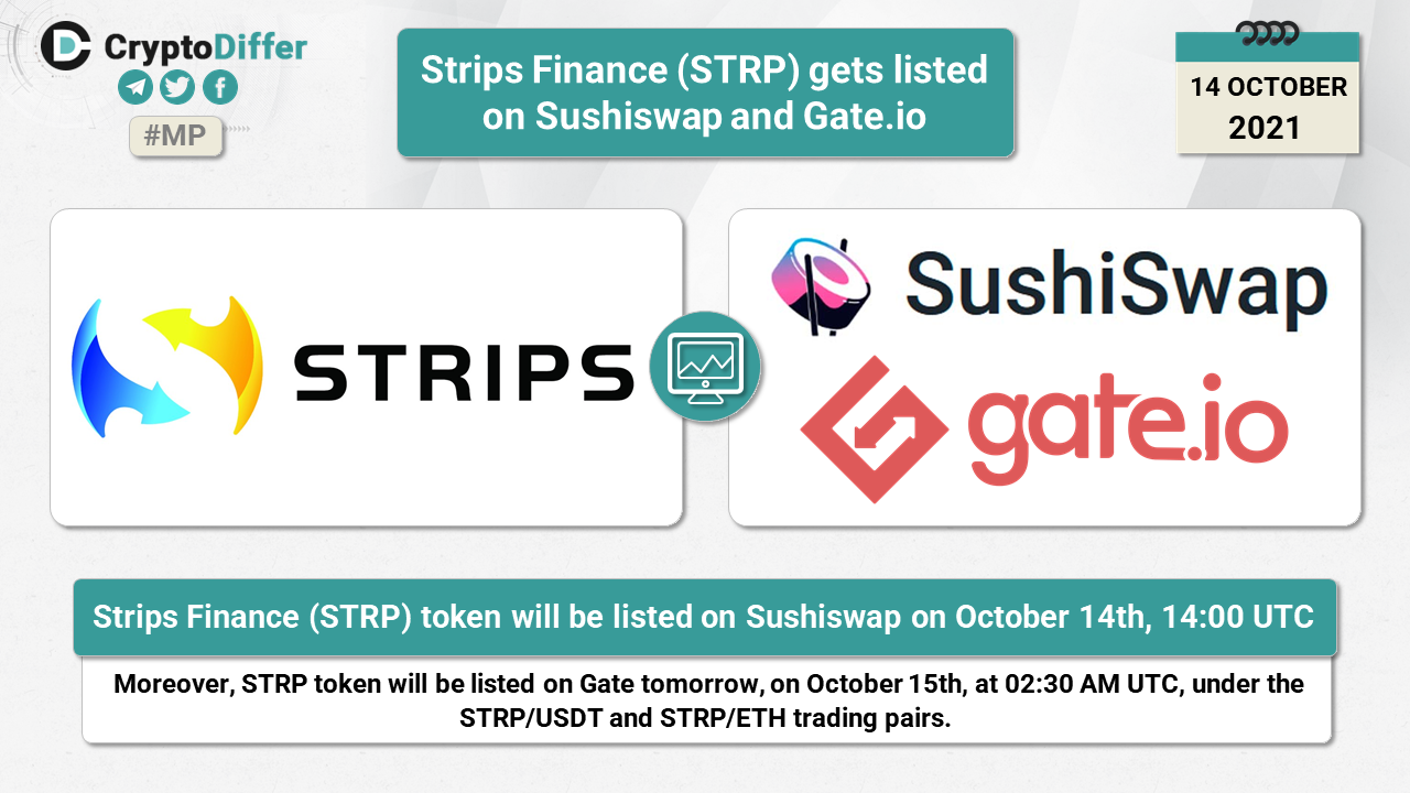 Strips Finance (STRP) token will be listed on Sushiswap on October 14th, 14:00 UTC. Moreover, STRP token will be listed on Gate tomorrow, on October 15th, at 02:30 AM UTC, under the STRP/USDT and STRP/ETH trading pairs.