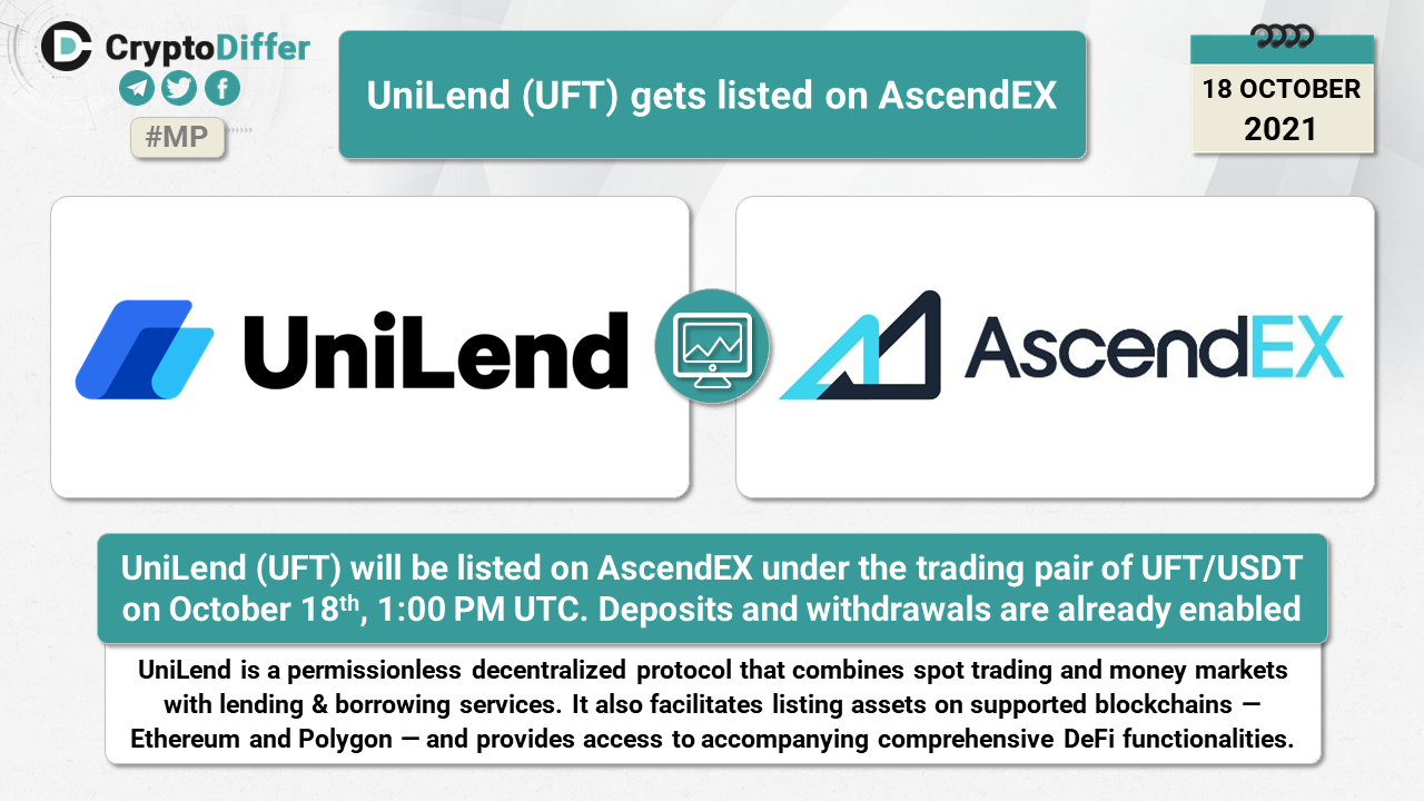 UniLend (UFT) will be listed on AscendEX under the trading pair of UFT/USDT on October 18th, 1:00 PM UTC. Deposits and withdrawals are already enabled.