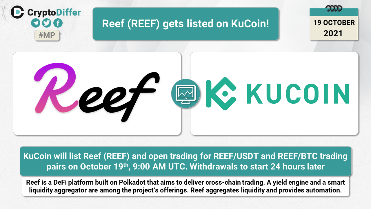 KuCoin will list Reef (REEF) and open trading for REEF/USDT and REEF/BTC trading pairs on October 19th, 9:00 AM UTC. Withdrawals to start 24 hours later.