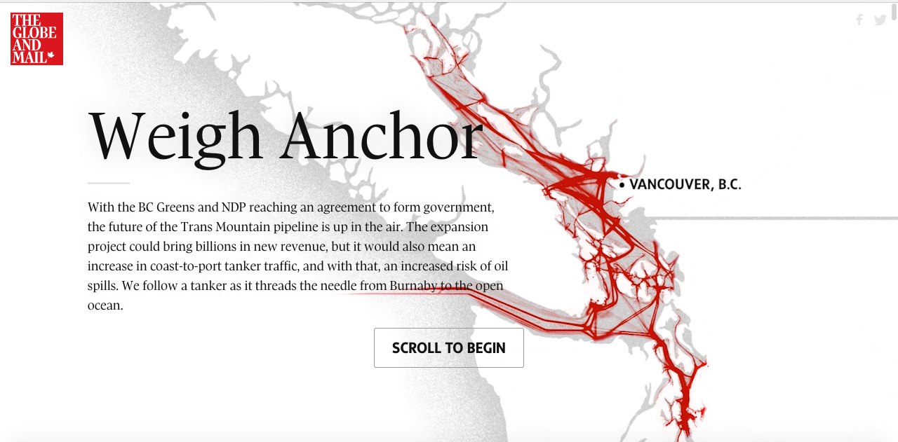 📈 Работа канадцев The Globe and Mail про новые терминалы в Ванкувере - призер Online Journalism Awards 2017. Сбалансированный лонгрид - история с несколькими сюжетными линиями. Данные использованы, чтобы показать трафик и маршруты, фото и видео - путь танкера через канал. Графика, анимация, карты - там есть все. Поплавать: https://beta.theglobeandmail.com/news/british-columbia/kinder-morgan-trans-mountain-pipeline-bc-coast/article35043172/?ref=https://www.theglobeandmail.com&