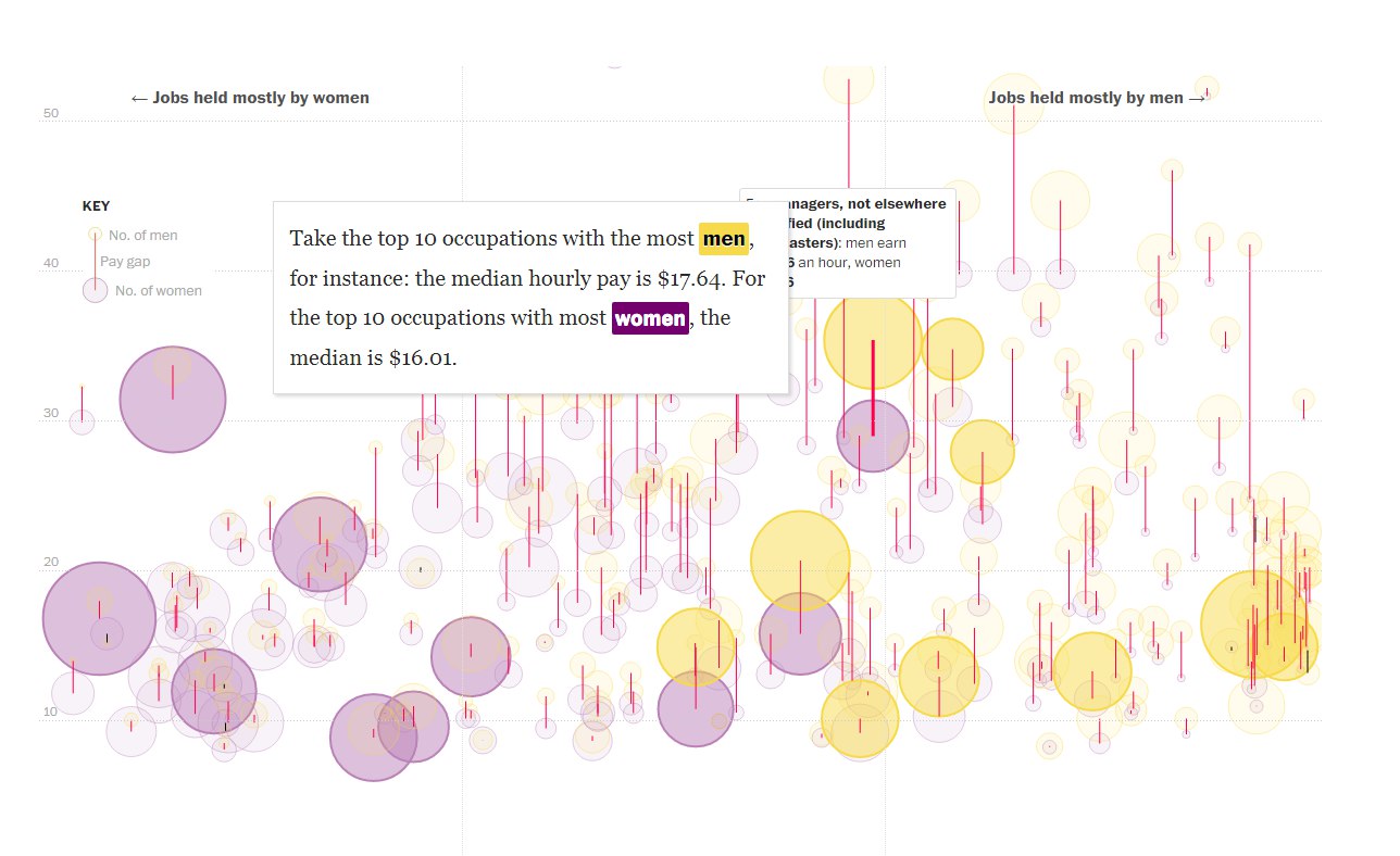 📈 WaPo выпустили спецпроект о том, насколько велика разница в зарплатах мужчин и женщин. Первая интерактивная визуализация с виду кажется странной и сложной, но при ближайшем рассмотрении оторваться невозможно. Второй интерактивный график с параллельными координатами классно показывает изменения в зарплатах. И цвета - мужской желтый, женский сиреневый - не смущают.
