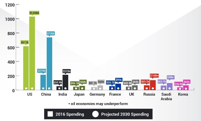 США потратили 750 млрд или как восемь следующих стран вместе взятых. Но это 3,4% ВВП, что ниже чем у СА, Израиля или РФ. Первую сверхдержаву активно догоняет Китай, который за 10 лет увеличил военный бюджет на 124%. США: минус 17%.