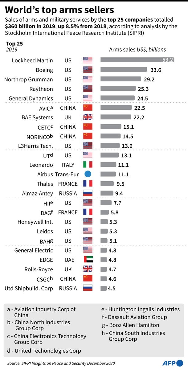 В прошлом году продажи 25 крупнейших оружейных компаний составили $361 млрд. 80 из 100 ведущих производителей вооружений базируются в США, Европе и России.