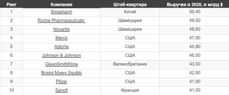 Фармацевтический рынок вырастет до $1.27 трлн. в этом году, $851 млрд из которых приходится на 50 корпораций, так называемой Биг Фармы. Кстати, всего 20 лет назад рынок оценивался втрое дешевле - $390 млрд.