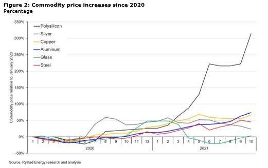 🔹Rystad Energy прогнозирует, что проекты СЭС мощностью 50 ГВт, строительство которых должно начаться в первой половине следующего года, находятся под угрозой переноса или даже отмены, поскольку цены на ключевые компоненты, используемые для производства модулей, продолжают расти. Среди основных факторов роста стоимости модулей в 2020 г. выделяют резкое подорожание поликремния, что также сказывается на стоимости алюминия и других важных компонентов. Увеличение затрат на модули и доставку по сравнению с предыдущим годом приведет к тому, что в проектах по генерации электроэнергии посредством солнца приведенная стоимость электроэнергии (LCOE) увеличится на 10–15%.