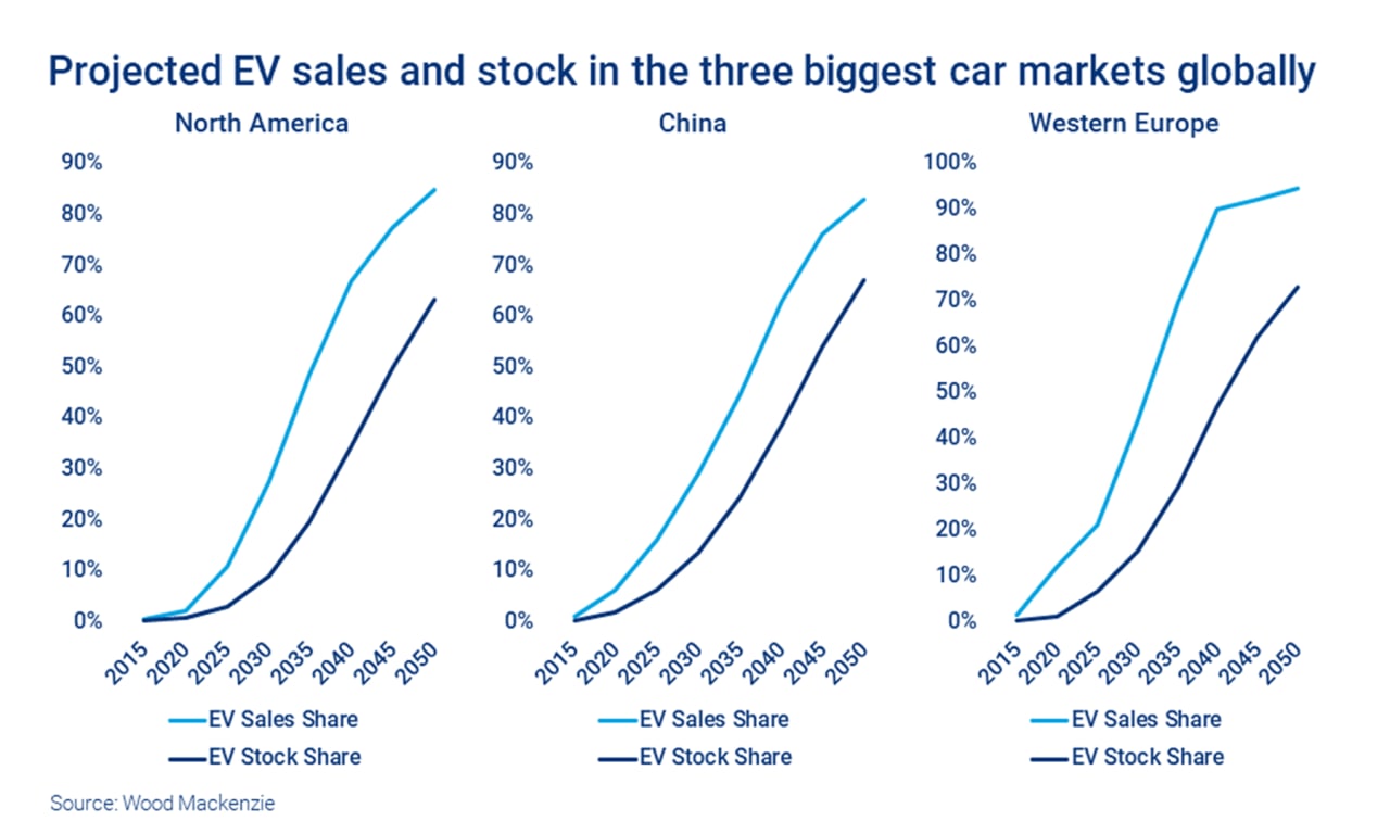 🔹По оценкам Woodmac, согласованные действия правительств и автопроизводителей в совокупности с прочими факторами позволят значительно увеличить долю электромобилей, по крайней мере, в крупнейших на текущий момент парках электротранспорта. В частности, в Северной Америке к 2050 г. доля электромобилей может достигнуть 64%, в Китае – 67%, в Западной Европе – 66%.