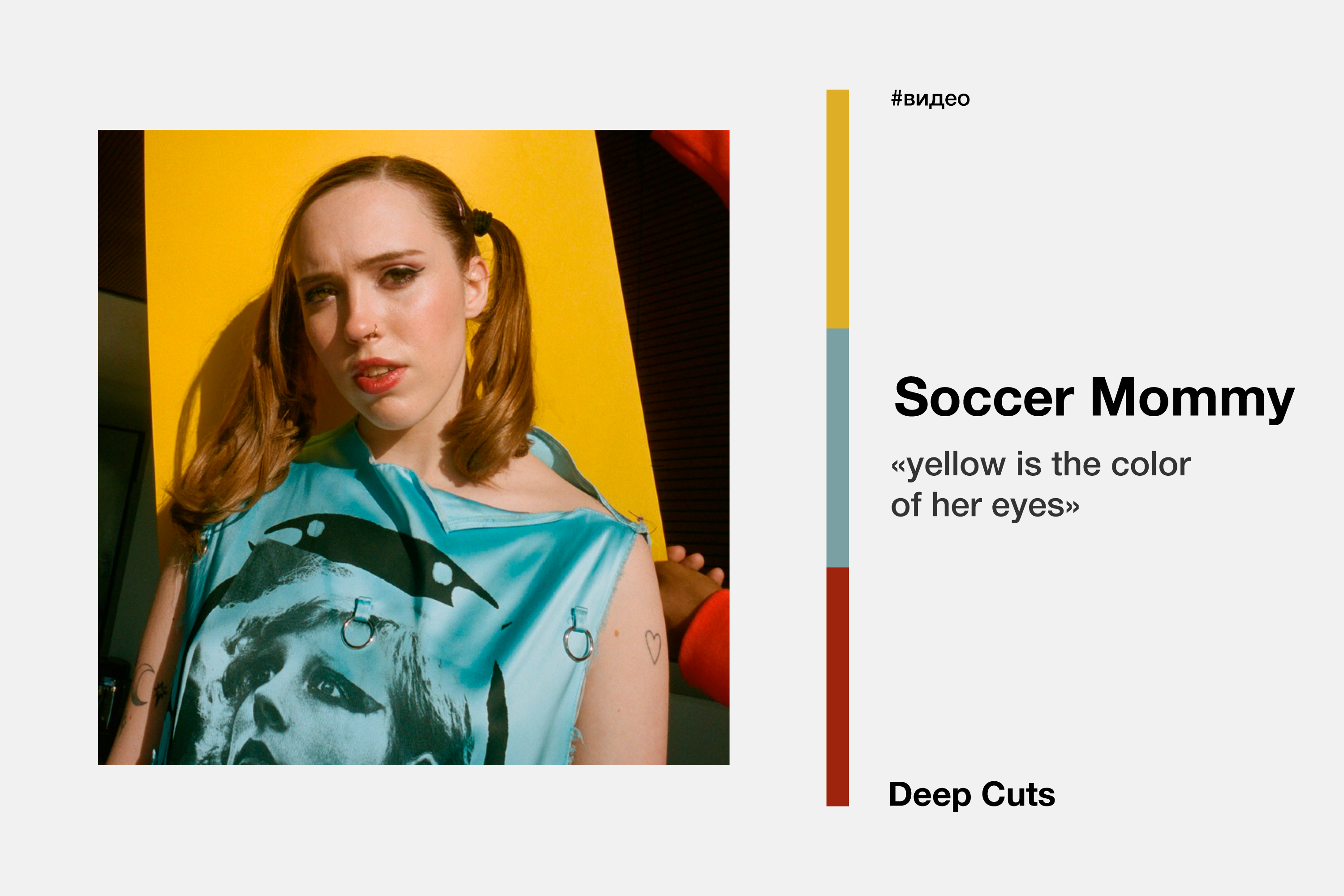 Софи Элиссон, более известная как Soccer Mommy — исполнительница и автор песен из Нашвилля. За 4 года активной творческой деятельности она записала три полноформатных альбома. Трек «yellow is the color of her eyes» стал синглом из нового альбома, в поддержку которому режиссером Алексом Россом Перри было снято видео.