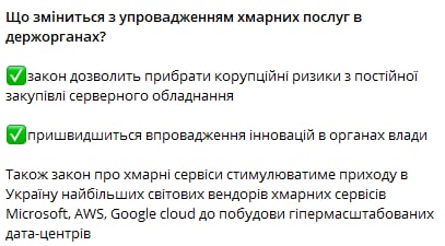 17 лютого 2022 року парламент прийняв закон про хмарні послуги. Це дозволить заощадити 40 млрд грн бюджетних коштів на IT. «Щоб обробляти більше інформації, органам влади та місцевого самоврядування необхідно періодично збільшувати кількість обчислювальних та людських ресурсів. Щоб оптимізувати цей процес, ми плануємо перенести основні процеси виробництва ІТ-серверів у «хмари», — повідомили у Мінцифрі.