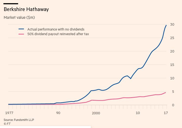 Berkshire Hathaway Баффета известна тем, что не платит дивиденды, реинвестируя прибыль в бизнес. Аналитики Fundsmith показали, какая доходность акций была бы, если компания выплачивала дивиденды в 50% от прибыли, по ним платился бы налог в 30%, а затем они реинвестировались в компанию (розовая линия). Наглядно, почему из-за налогов выплата дивидендов эффективной растущей компанией может быть неэффективным способом распределения капитала.