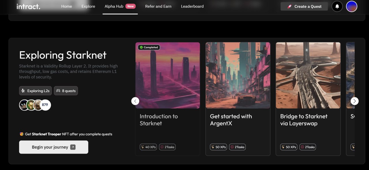 Сейчас мы можем пройти несколько квестов в сети StarkNet на площадке Intract. Тем самым немного прогреем свой кошелек и добавим доп. активностей по ретродроп