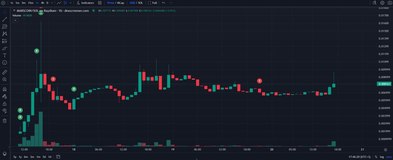 MARSCOIN — недавно выпущенный новый мем токен на Solan'е. Токен уже имеет капу 2.4 млн$ и 70к$ ликвы, отслеживать цену можно на Dexscreener'е