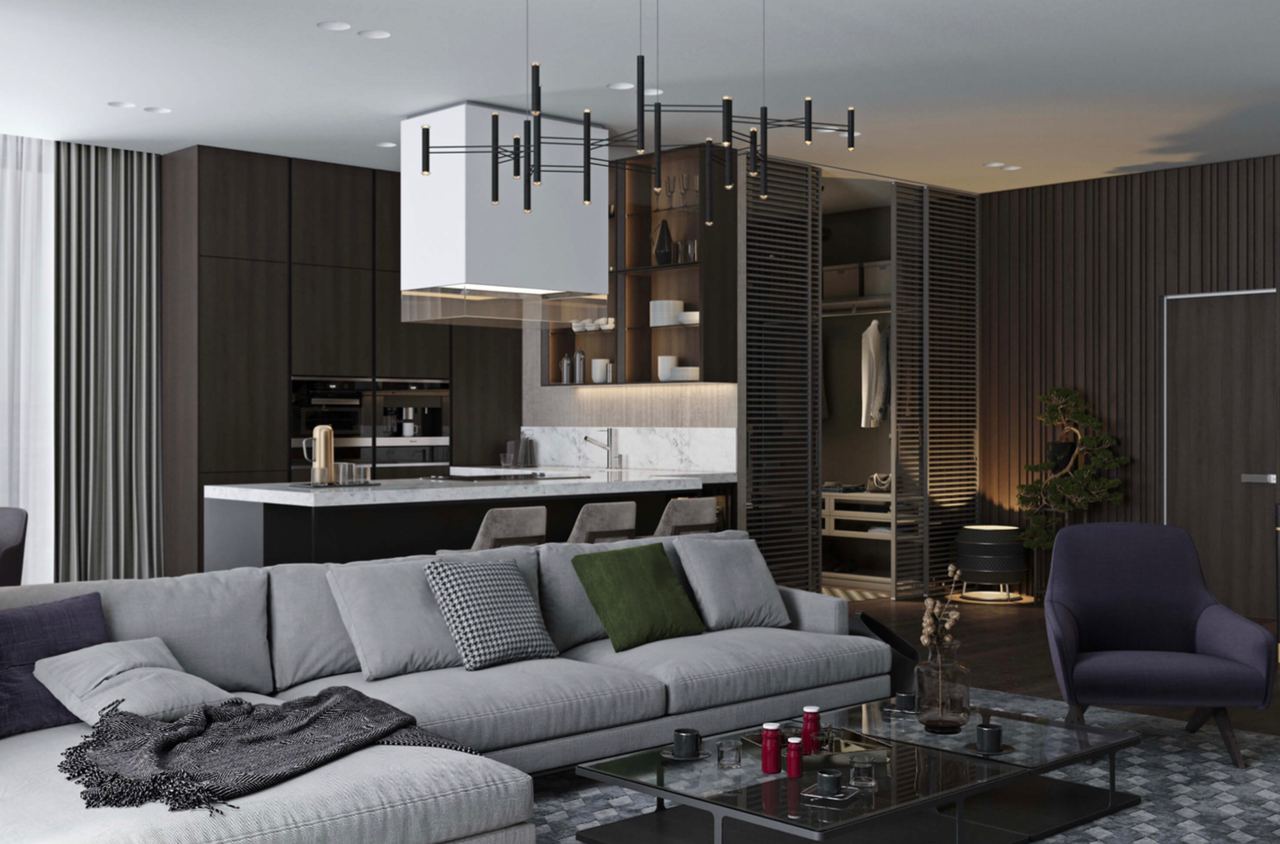 Несколько слов об актуальных в 2020 году трендах дизайна зоны кухни-гостиной: