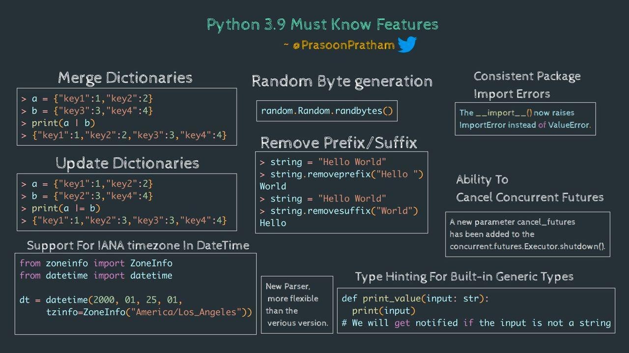 🐍 Пару дней назад вышел релиз Python 3.9. Уже даже инфографика с нововведениями есть